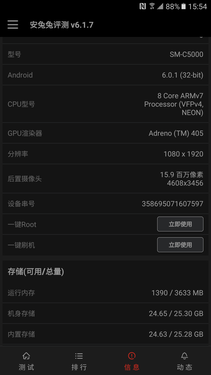 三星Galaxy C5采用高通驍龍617八核處理器,這顆處理器在聯發科X20以及高通驍龍650在千元市場遍地跑的時代確實有些一般,它的安兔兔測試成績也支持在4.5萬左右,好在它采用4GB RAM+32GB ROM的組合,大內存一定程度上保證了整機的流暢性。