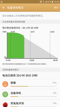 Galaxy C5配備2600mAh電池,對于這款輕薄機型來說還能接受,它的續航表現也還不錯,連接WiFi的情況下待機7小時耗費5%的電量,打三把王者榮耀耗費的電量在20%左右,基本上能夠滿足一天的使用需求。它還標配9V/1.67A的快充頭,實測充電10分鐘能夠充入11%左右的電量,從5%充到滿電耗費的時間為88分鐘,整體速度還是不錯的。