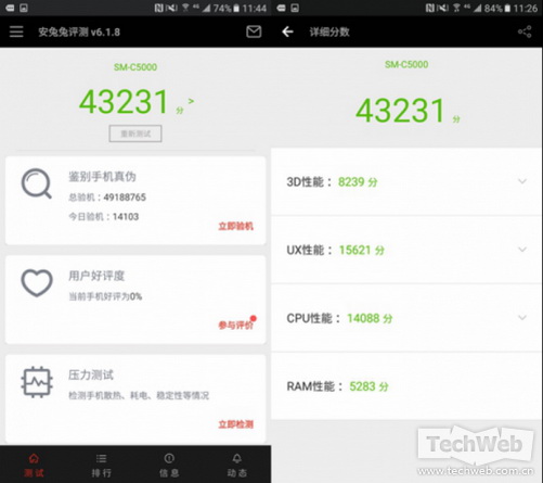 通過使用安兔兔來對三星Galaxy C5的性能進行跑分測試43231分,當然這跑分不是最好的,綜合排行跑分在魅藍note3之上,確實在同價位手機沒有太大優勢,但重點看均衡體驗,有不錯的優化系統方案,能夠對卡頓智能優化,保證系統內存輕重分配,在《王者榮耀》游戲體驗下,沒有出現過分的卡頓,屏幕畫質視覺很靚麗、很舒服,可以滿足平常不錯的游戲體驗。如果用戶在不用手機狀態時,開啟日常APP,此時CPU頻率會降低,節省功耗,大大提高了手機的續航。