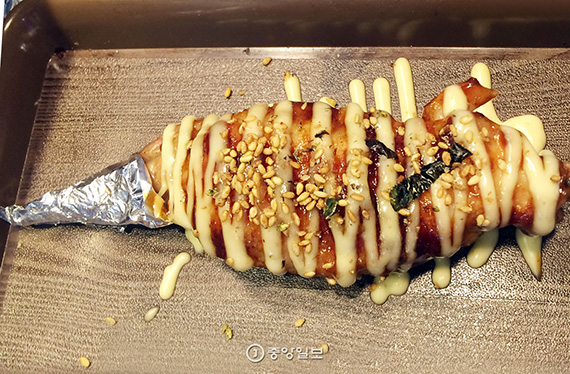 雞翅炒飯是首先在臺灣流行起來的街邊飲食。雞翅很大,里邊放滿了炒飯,把整個雞翅去骨后填滿炒飯,涂上辣醬烤制而成。根據里面所放的調味料,可選擇烤肉味、泡菜味、咖喱味。即便只吃一份,肚子也會很飽。價格:3500韓元(約合人民幣20元)