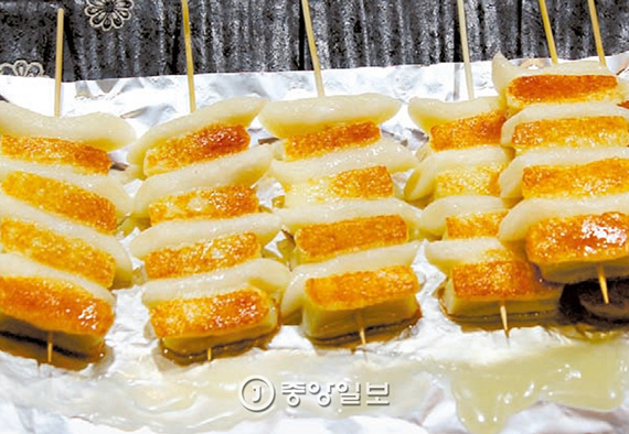 將炒年糕用的年糕和大塊芝士串到竹簽上后放到平底鍋上烤。將烤得焦黃焦黃的芝士年糕串涂滿煉乳即可,勁道且好吃。也可不要年糕只烤芝士吃。價格:3000-4000韓元(約合人民幣17-23元)