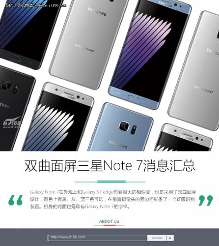 根據此前twitter上的爆料大神Evan Blass在近日放出的有關Note 7的渲染圖可以看出,Galaxy Note 7在外觀上和Galaxy S7 edge很相似,也是采用了雙曲面屏設計,顏色上有黑、灰、藍三色可選,在前置攝像頭的旁邊還配備了一個虹膜識別裝置。機身的背面Galaxy Note 7的字樣也確定了該機的命名。相信許多朋友不只關心這款產品的名稱,還更為關心這款產品有著什么樣的配置及特色,接下來就為大家帶來關于這款手機的消息匯總。