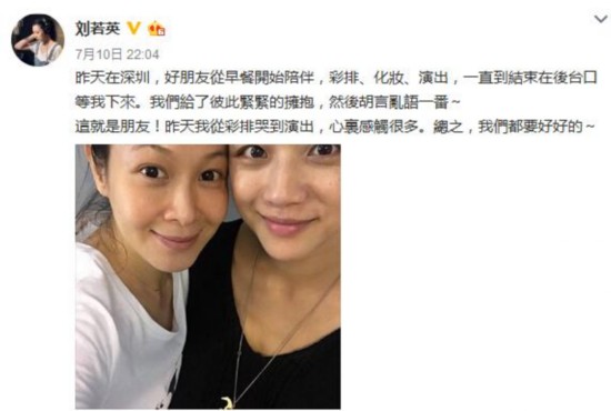 劉若英微博中稱:“昨天在深圳,好朋友從早餐開始陪伴,彩排、化妝、演出,一直到結束在后臺口等我下來。我們給了彼此緊緊的擁抱,然后胡言亂語一番,這就是朋友!昨天我從彩排哭到演出,心里感觸很多??傊?,我們都要好好的!”照片中,劉若英和湯唯均純素顏,更不美圖!兩人摟抱在一起,并親密地臉貼臉,非常的友好。