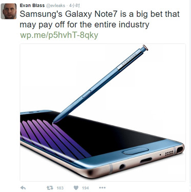 臨近8月2日紐約發布會,著名爆料大神@evleaks 給出了三星Galaxy Note 7的最新渲染圖。大神還不吝溢美之詞,Note 7是三星的絕對大招,整個工業界都將震撼。從這張渲染圖,我們可以清楚地看到采用珊瑚藍、雙曲面機身+金屬邊框的三星新機皇。底部接口非常豐富,從左至右依次是3.5mm耳機孔、USB Type-C、降噪Mic、揚聲器和S-Pen插槽。