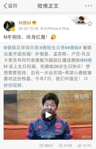 亞洲頂級球星樸智星為鹿晗送上生日祝福。