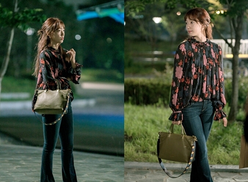 在另一組造型中,樸信惠用印花上衣搭配闊腿牛仔褲,顯得腿十分修長。再搭配上隨意的半丸子頭,清新時尚。