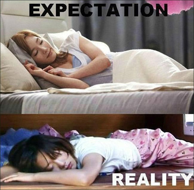 上圖是韓國少女時代組合隊長泰妍的床具廣告照與生活中睡照的對比,泰妍在廣告中的睡姿,端莊有氣質,宛如乖巧的貓咪,十分恬靜。而現實生活中的睡姿則是四仰八叉地爬在床上酣睡,原來在現實生活中,“女神”其實是“屌絲”。