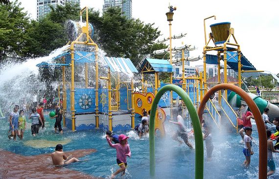 仁川文化公園的水上樂園設有彎彎曲曲的隧道滑道和幼兒滑梯等各種各樣的娛樂設施。水上設施被建成船的模樣。在多艘船的帆和船頭里設置有水桶,水由此傾瀉而出,非常適合避暑。此外,在水上樂園旁邊的樹蔭下鋪開涼席稍作休息也很舒服。仁川文化公園水上樂園每天晚上都會進行消毒,并在次日早晨重新換水,因此水質非常干凈。