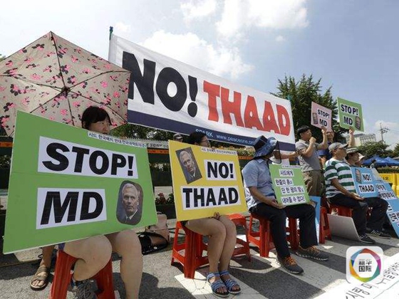 抗議者舉著反對薩德的標語牌,在首爾韓國國防部前抗議美國在韓部署薩德系統