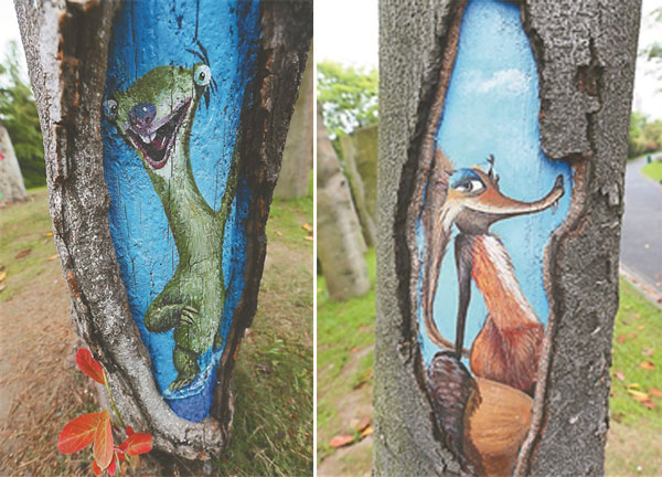 2015年4月,在江蘇省南通市,一幅幅妙趣橫生的“樹洞畫”吸引了人們的目光。這些畫是由專業畫師巧妙利用樹洞和樹干的形狀繪制的,所用顏料是特制丙烯顏料,對樹木沒有傷害,也不會褪色。