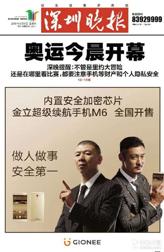 8月6日,盛大的里約奧運會開幕式正式舉行。與此同時,筆者的微信朋友圈卻突然被金立手機刷屏了。原來,金立手機投放了深圳晚報的頭版廣告,并將本屆里約奧運會最大的槽點“安全問題”與金立手機M6系列的“內置安全加密芯片”巧妙融合起來,技術含量十足,引發了人們的強烈共鳴。