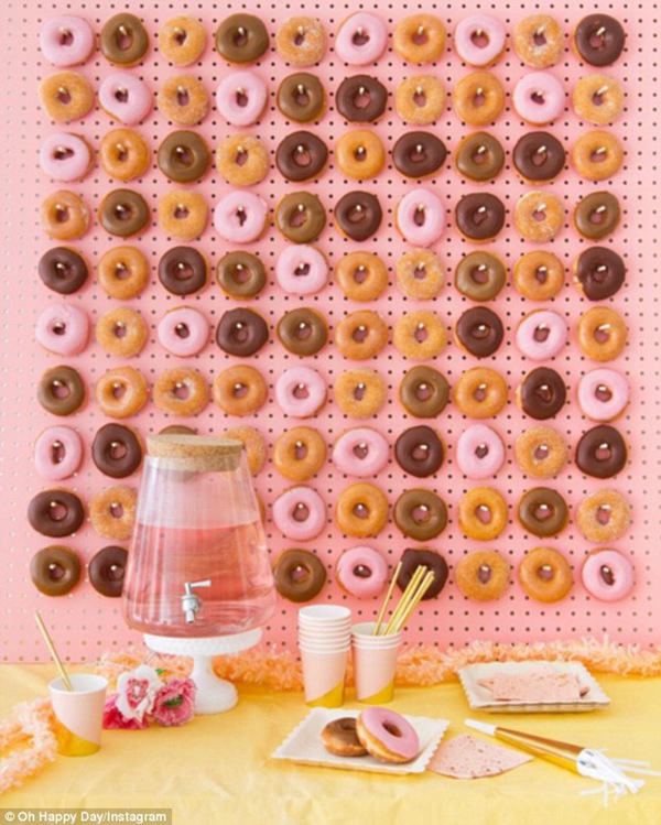 從布滿童話般光彩的森林到一整個大蛋糕,婚禮宴會一直不缺乏創意。最近“甜甜圈墻”就火了起來,只要把釘子釘到墻里,然后掛上甜甜圈就完成了。