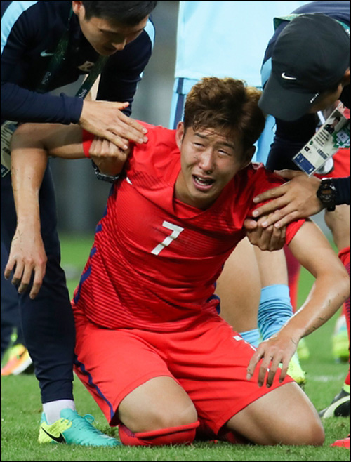 8月17日,韓國男足國奧隊抵達仁川國際機場,隊員們個個面色凝重。他們在里約奧運會男足1/4決賽中0:1不敵洪都拉斯,止步八強。那場比賽的終場哨響起后,韓國隊領軍人物孫興慜跪地不起,失聲痛哭。