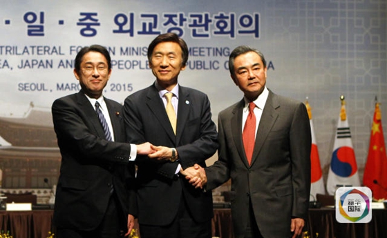 2015年3月21日,中國外交部長王毅(右)與韓國外交部長尹炳世(中)、日本外相岸田文雄在第七次中日韓外長會前合影。