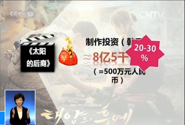 央視以2016年大熱韓劇《太陽的后裔》為例,具體介紹了其制作投資費,共計8.5億元韓幣(約合人民幣500萬元),其中男女主角所得到的片酬在20%-30%之間。