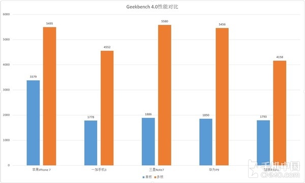 那么iPhone 7遇到安卓旗艦會如何呢?我們選擇了三星Note7(Exynos 8890)、一加手機3(驍龍820)、魅族PRO 6(聯發科X25)以及華為P9(麒麟955)這四大天王作為對比,測試軟件同為Geekbench 4.0。