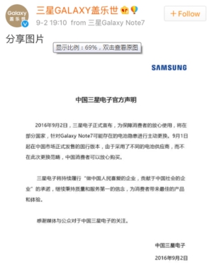 迫于壓力,三星方面關于Note7在中國的政策也發生了變化。9月14日,三星在國家質檢總局備案,宣布召回2016年7月20日至2016年8月5日期間制造的1858臺Note7手機。