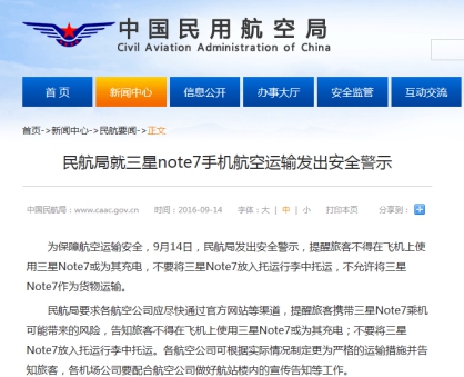 受三星“炸機門”事件持續發酵的影響,為了保障乘客出行安全,中國各大航空公司對三星Note7紛紛下達了“封殺令”! 9月13日,中國首家航空公司-海南航空宣布禁止集團員工攜帶Note7登機、托運,并且也不接受旅客在飛機上使用和托運Note7。隨后,中國民航局要求各航空公司應盡快通過官方網站等渠道,提醒旅客攜帶Note7乘機可能帶來的風險。截至9月15日,中國國內已有14家航空公司針對Note7出臺禁令。