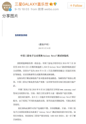 三星終于宣布:在中國大陸召回1858部Note7