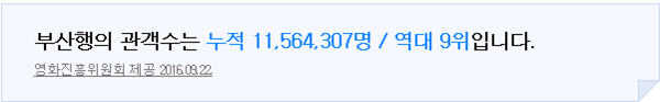 韓國電影振興委員會9月22日發布的數據顯示,《釜山行》累計觀影人數約為1156.4萬人次,在韓國電影史上排名第九位。