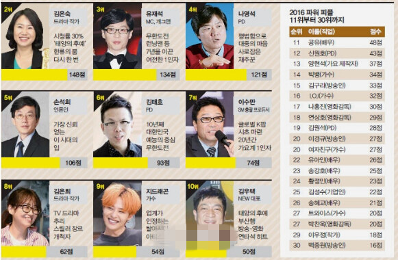 “2016韓國演藝圈最具影響力人物”榜單