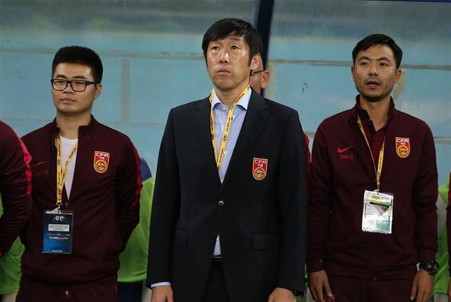 10月11日,中國隊主教練高洪波(中)在比賽前。當日,在烏茲別克斯坦塔什干本尤德科體育場舉行的2018年世界杯預選賽亞洲區12強賽中,中國隊客場0-2不敵烏茲別克斯坦隊。 新華社記者曹燦攝