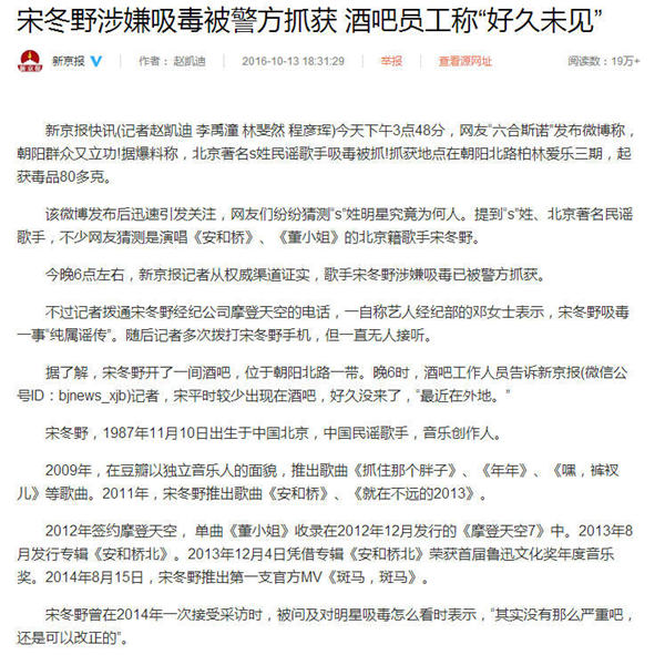 人民網10月14日訊 據多家媒體報道,13日下午,有微博博主爆料稱,北京著名s姓民謠歌手吸毒被抓。后據新京報報道,新京報記者從權威渠道證實,歌手宋冬野涉嫌吸毒已被警方抓獲。