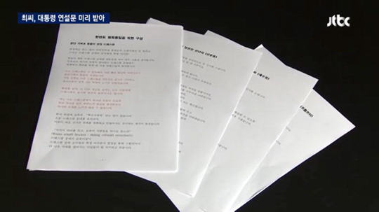 24日晚,韓國JTBC電視臺報道稱,在崔順實辦公室電腦中發現了200多份文件,其中44份為總統樸槿惠的演講稿,包括各種公開活動演講稿、國務會議發言稿、大選拉票演講稿、大選候選人電視辯論發言稿等。這些演講稿最早在樸槿惠發表演講4天前就已到崔順實手中。
