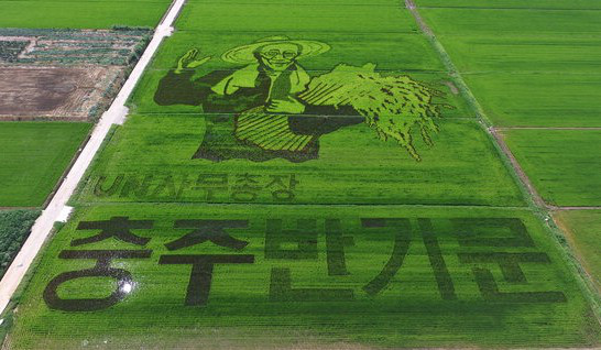 7月26日,韓國忠清北道忠州市,巨幅潘基文肖像畫現身稻田。(圖片來源:韓國NAVER網頁截圖)
